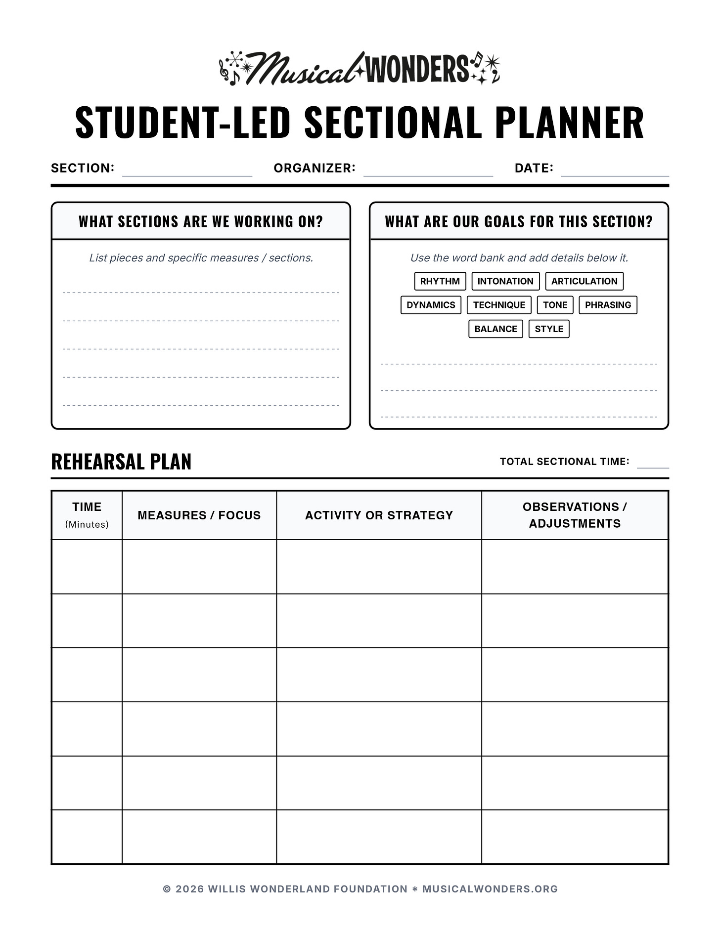 Shift the Responsibility: Eventually, students will take over the full planning process. They will use the Student-Led Sectional Planner to list their pieces and specific measures.