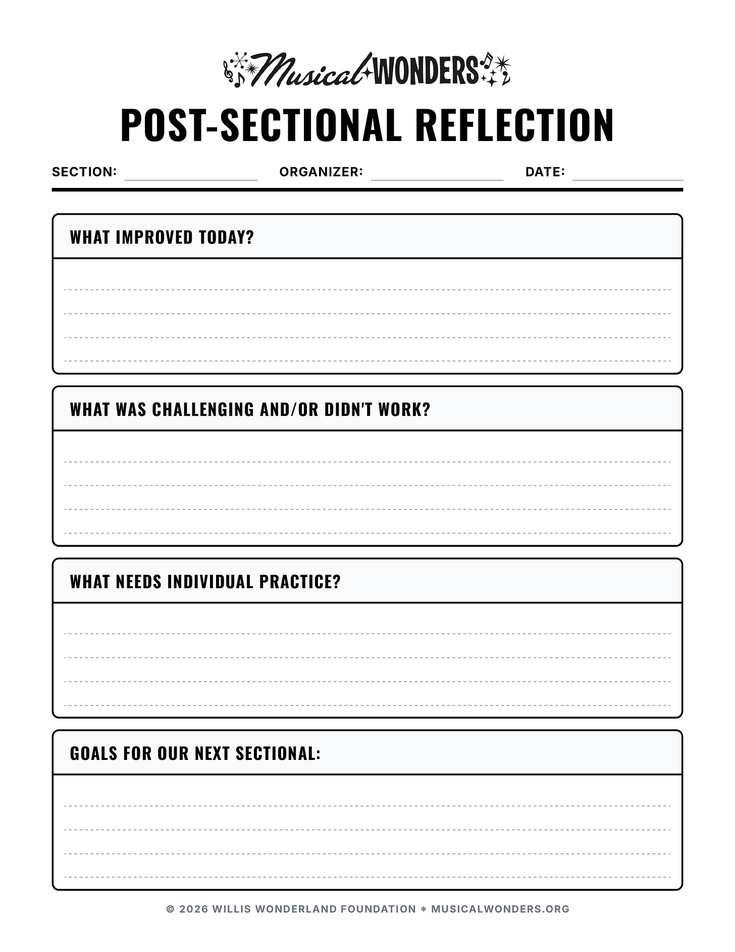 For this process to be truly effective, you must ensure groups leave at least five to ten minutes at the end of their rehearsal for the Post-Sectional Reflection. This will become faster after a few repetitions, but it is worth the time to make sure that each sectional is more productive than the last.