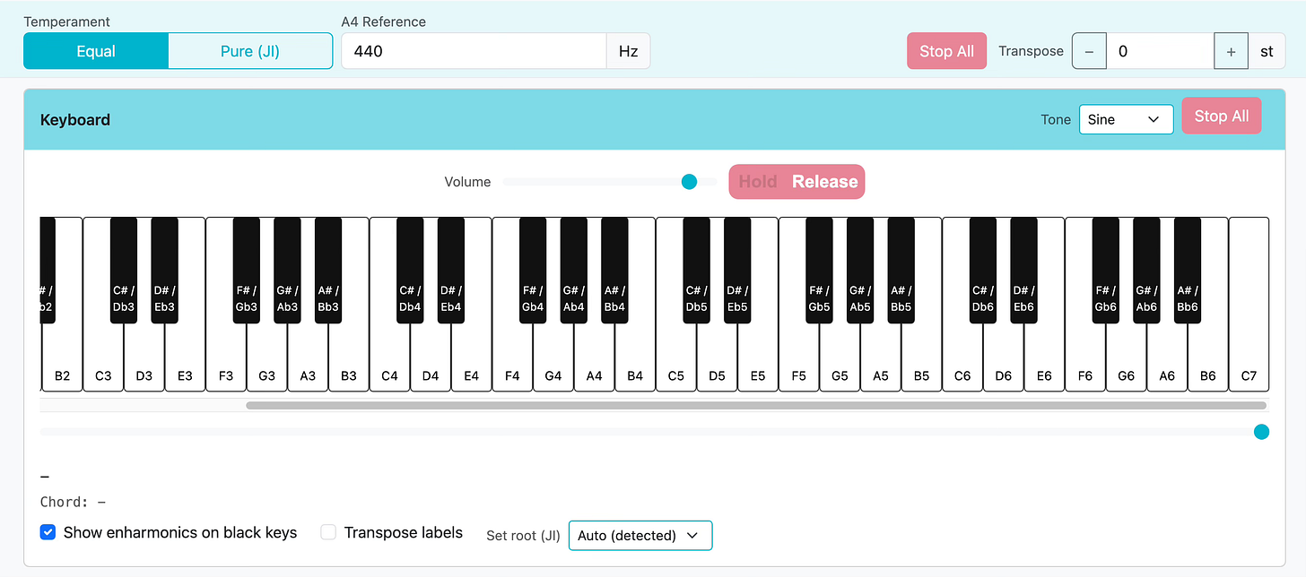 Switch between Equal Temperament (what most modern instruments use) and Pure Temperament for hands-on comparison.