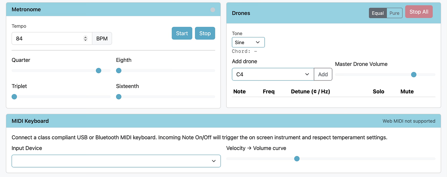 Our new Online Director Keyboard is not meant to replace a Harmony Director Keyboard. Instead, it’s designed as a portable, always-available introduction to drone tuning and the differences between pure (just) temperament and equal temperament.