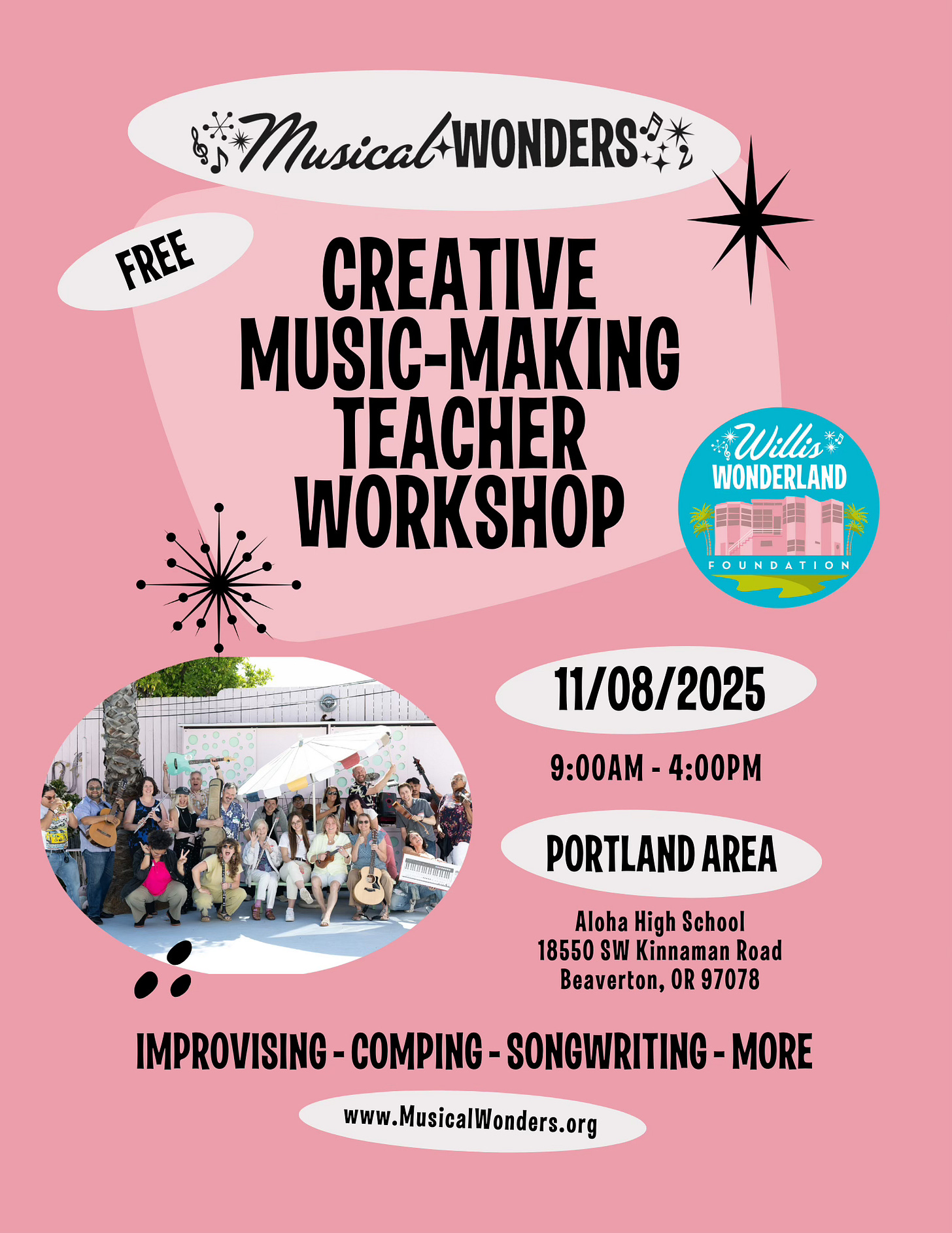 We’re thrilled to invite you to our next Creative Music-Making Workshop, happening in the Portland area on Saturday, November 8th! This workshop is offered for free due to generous support from the Willis Wonderland Foundation.