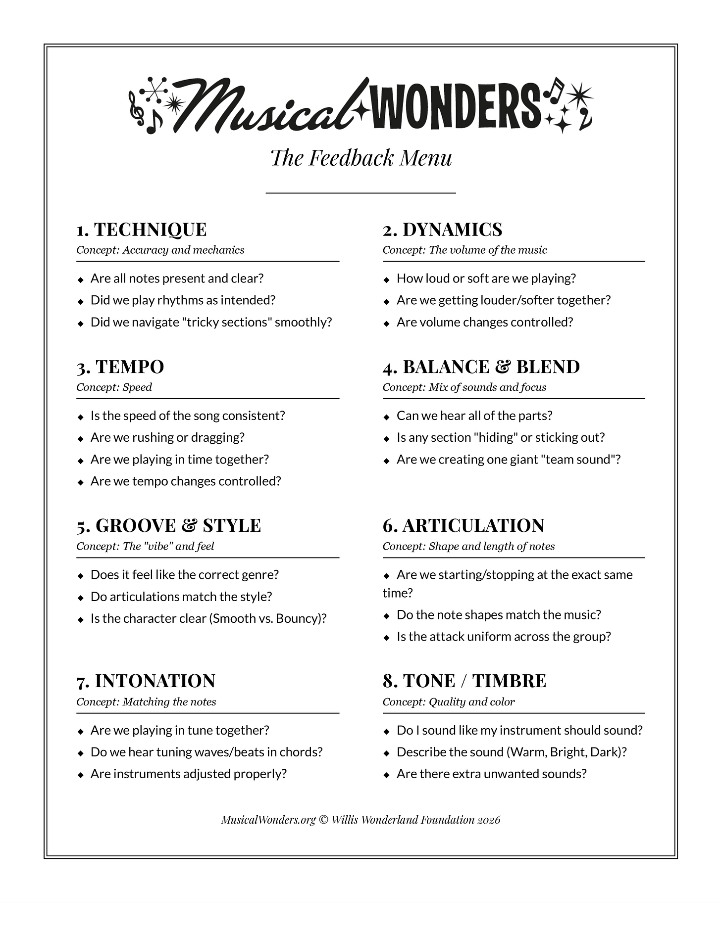 Simply asking the question gives students a moment to think and changes the rehearsal dynamic from “waiting to be told what’s wrong” to “actively listening for things we can improve.” Between these two practices, I find that students are able to identify the problem 90 percent (or more) of the time. If they can’t, I know what fundamentals need to be addressed!