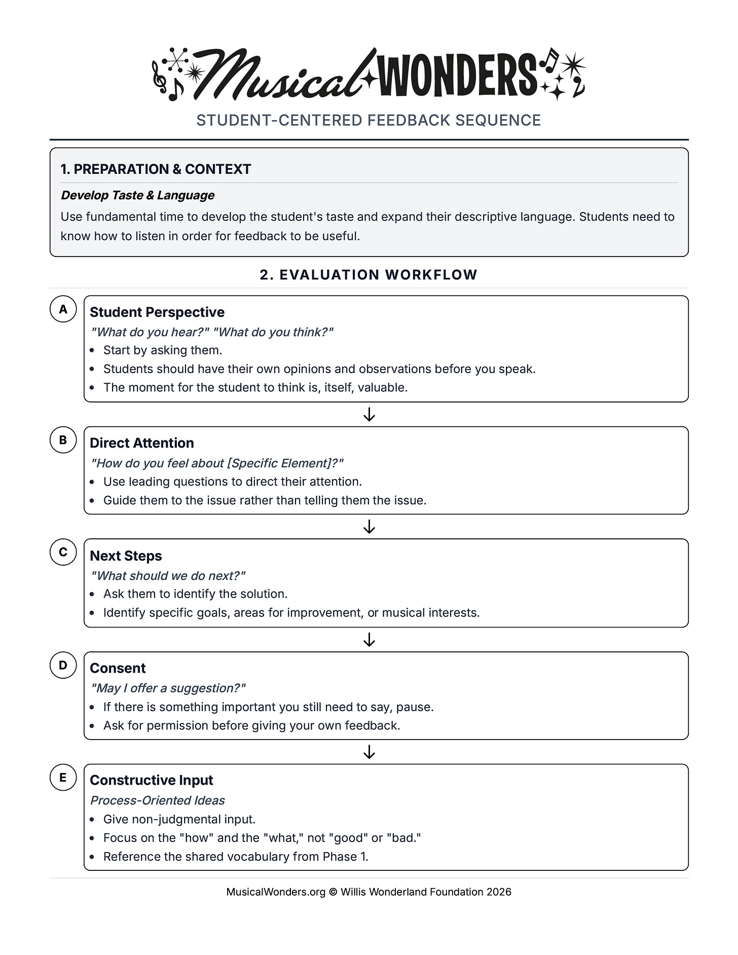 This diagram is an abbreviation of this feedback sequence. In real life, it takes practice and nuance. Just remember, the focus is on helping the students develop taste and enhance their artistry, not just to fix a problem. While that takes some extra time to begin with, students start to find and solve their own problems. This is not only a time saver down the road, but central to a habit of lifelong musicianship.