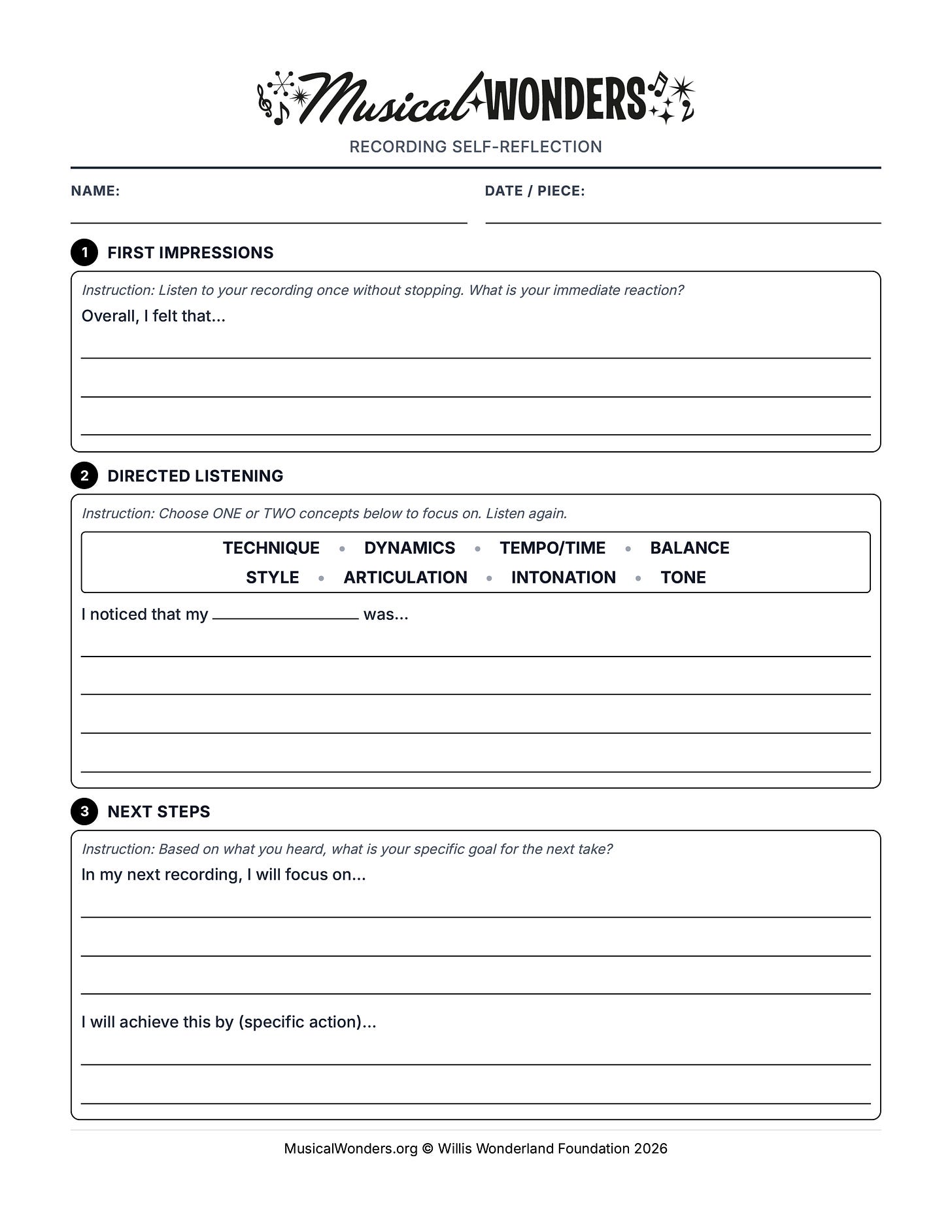 One other strategy that can be incredibly powerful is for students to be in the habit of listening to and reflecting on recordings of themselves. This handout is a great way to have students go through this feedback sequence independently.